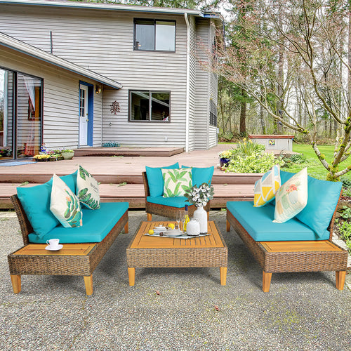 Gymax 4PCS Rattan Patio Sofa Set Outdoor Furniture Set with Turquoise Cushions