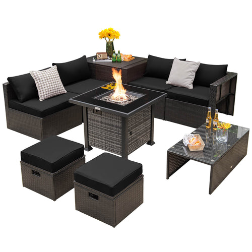 Gymax 9 Pieces Furniture Set with 50,000 BTU Propane Fire Pit Table Patio Black
