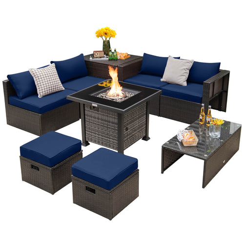 Gymax 9 Pieces Furniture Set with 50,000 BTU Propane Fire Pit Table Patio Navy