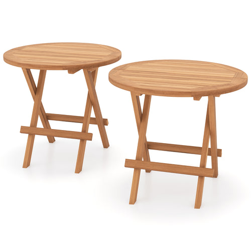 Gymax 2PCS Table Indonesia Teak Wood Round Slatted Tabletop Portable Camping Folding Side Patio