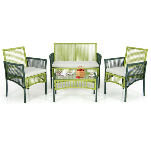 Gymax 4PCS Round Wicker Conversation Set With Cushions Tempered Glass Side Table Patio