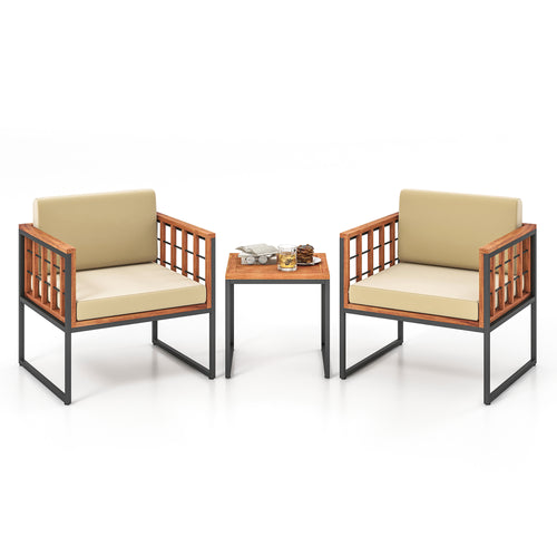 Gymax 3 Pieces Patio Furniture Set Acacia Wood Bistro Conversation Set with 2 Cushioned Chairs Beige