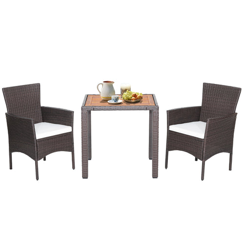 Gymax Set of 3 Wicker Dining Set Acacia Wood Table Top With Cushioned Chairs Patio Garden