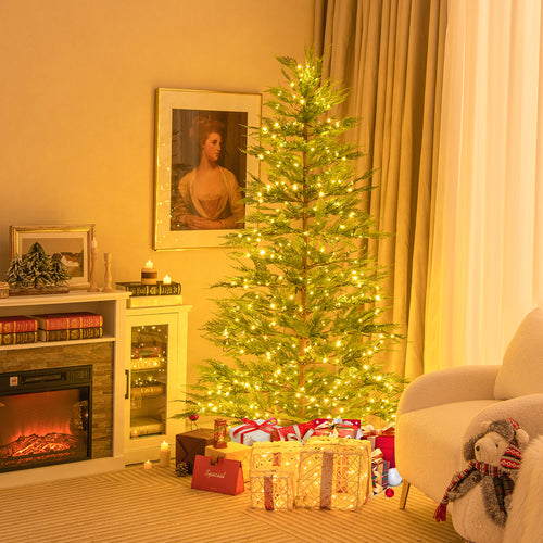 Gymax 7 FT Pre-Lit Artificial Christmas Tree Slim Pencil Xmas Tree with 466 Snow-Flocked Branch Tips