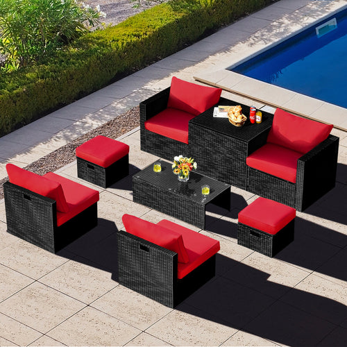 Gymax 8PCS Rattan Patio Sectional Furniture Set w/ Waterproof Cover & Red Cushions