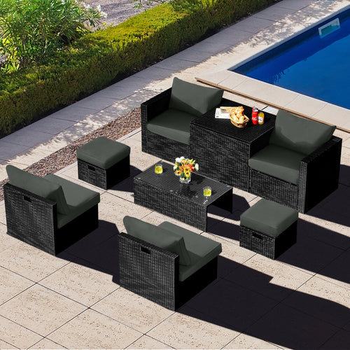 Gymax 8PCS Rattan Patio Sectional Furniture Set w/ Waterproof Cover & Grey Cushions