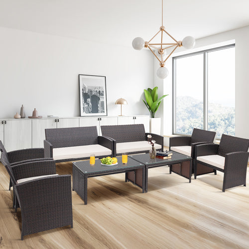 Gymax 8PCS Patio Conversation Set Outdoor Rattan Furniture Set w/ White Cushions