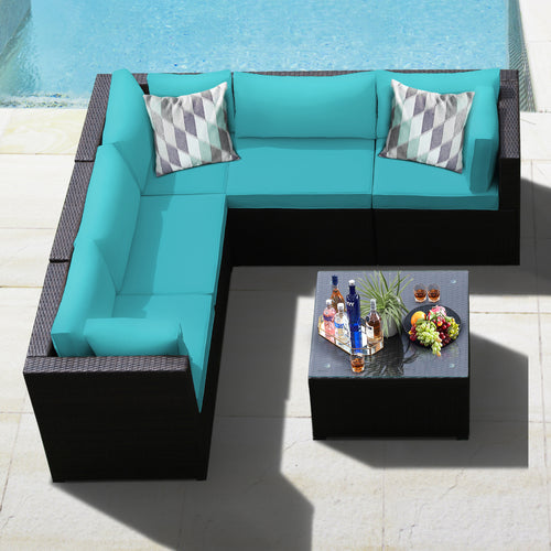 Gymax 6PCS Rattan Patio Sectional Sofa Conversation Set Outdoor w/ Turquoise Cushions