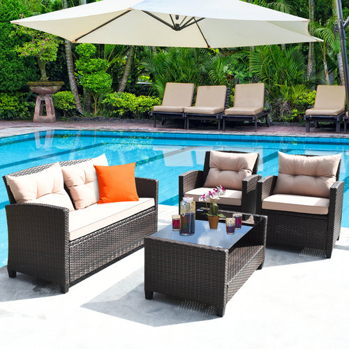 Gymax 4PCS Rattan Patio Conversation Set Outdoor w/ Coffee Table Cushioned Sofa