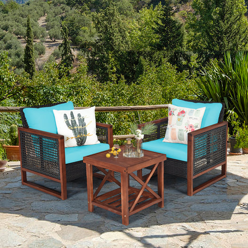 Gymax 3PCS Rattan Wicker Patio Conversation Set Outdoor Furniture Set w/ Turquoise Cushion