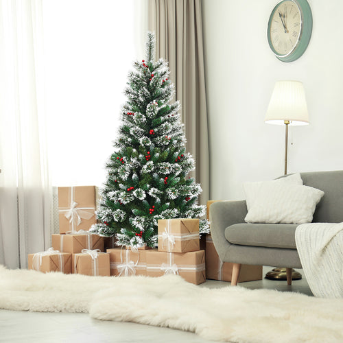 Gymax 5FT Unlit Snow Flocked Christmas Tree Artificial Hinged Pine Tree w/ Red Berries