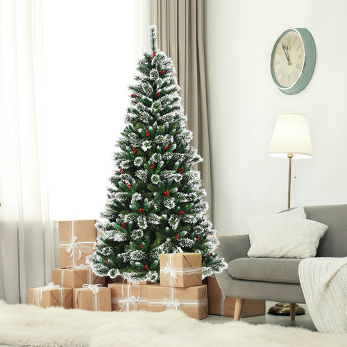 Gymax 7 FT Artificial Christmas Tree Snow Flocked Hinged Tree w/ Red Berries