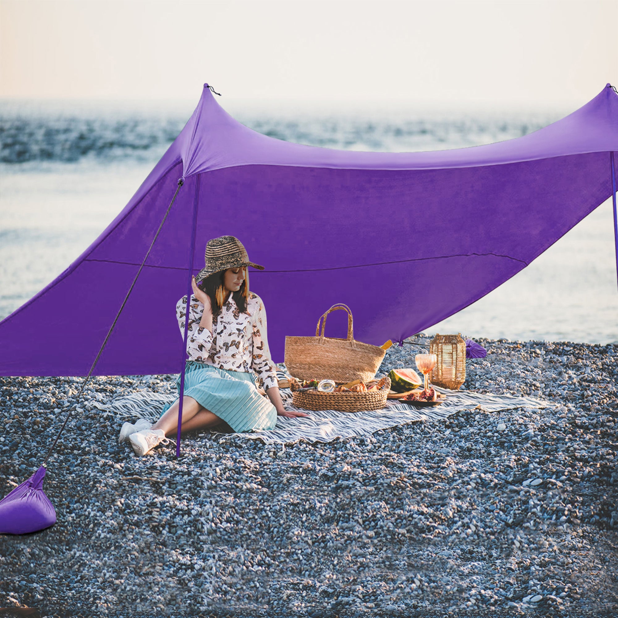 Are you finding a suitable canopy to provide shelter for some outdoor activities? Our beach tent which can be conveniently stored in a portable bag to carry will be perfect for many outdoor activities like parties, camping, flea markets etc. Constructed of premium aluminum poles, the frame of the tent is rust-resistant and can provide long time service. And metal edges, peg stakes and sand bags which come with tent can also add stability of tent. Lycra canopy blocks intense sunlight and provides UPF50+ protection. Under this canopy, there is enough space for you to place furniture like deck chair, table and loveseat to enjoy leisure time with your family or friends.
